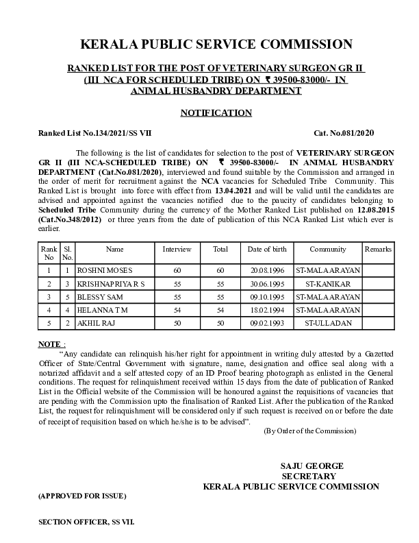 Psc Veterinary Surgeon Animal Husbandry Ranklist 2021 With Cut Off Mark Www Keralapscnotifications Com